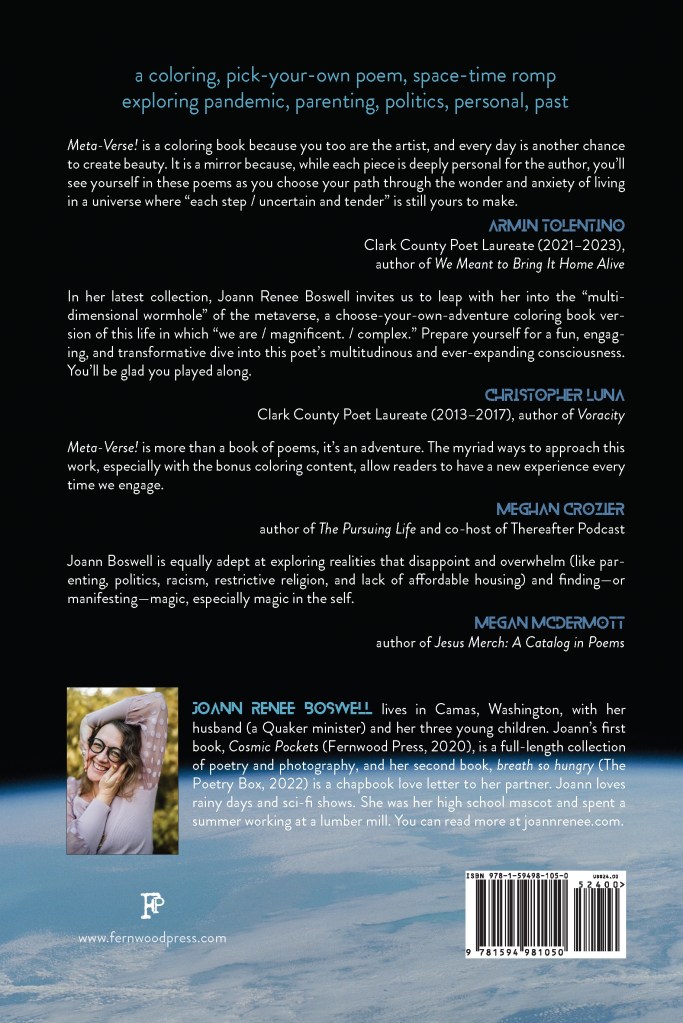Meta-Verse! is more than a book of poems, it’s an adventure. Jo is creative, witty, and charming as she uses her poetry to guide us on a journey in, around, and through an expansive understanding of the world around us. The myriad ways to approach this work, especially with the bonus coloring content, allows readers to have a new experience every time we engage. You don’t want to miss this unique insight into family, love, relationships, pandemic life, and so much more.